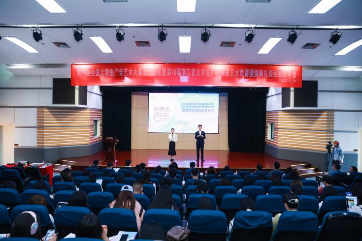 2023年4月16日上午9时,第14届全国大学生广告艺术大赛浙江赛区暨第10届浙江省大学生广告创意艺术竞赛颁奖典礼暨经验分享会在浙江大学紫金港校区临水报告厅隆重举行,本次活动由全国大学生广告艺术大赛组委会组织,大广赛浙江赛区组委会主办,浙江大学传媒与国际文化学院承办。本次活动主要分四个单元,分别是领导致辞、颁奖典礼、调研报告发布、优秀指导教师经验分享等。
