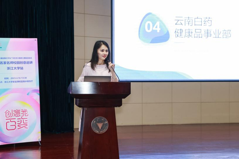 云南白药集团健康产品事业部品效营销BC总经理助力管毓星女士为我们解析云南白药口腔健康命题,她介绍了云南白药发展历程,并着重介绍了云南白药口腔健康品事业部。对于云南白药独特的“治愈力”进行了详细阐述,为了更符合Z时代的兴趣,其品牌调性也在不断地进行年轻化创新。会议中,管女士强调口腔问题人群是此次命题的目标消费群体,在治愈感和治愈力的基础上,对于不同类别的广告形式进行了逐一讲解,并公布云南白药牙膏“企业特别奖”及相关福利,吸引了大波师生的关注。