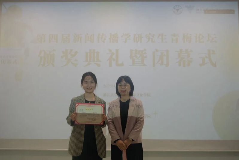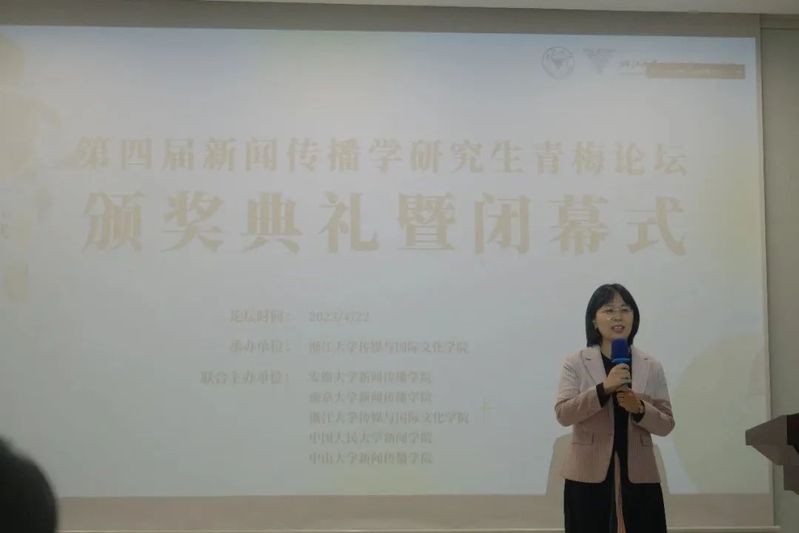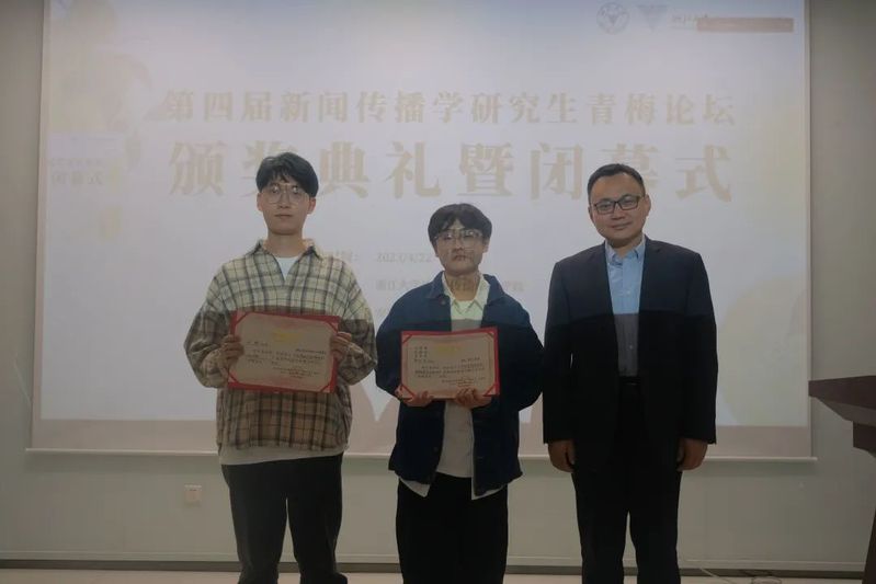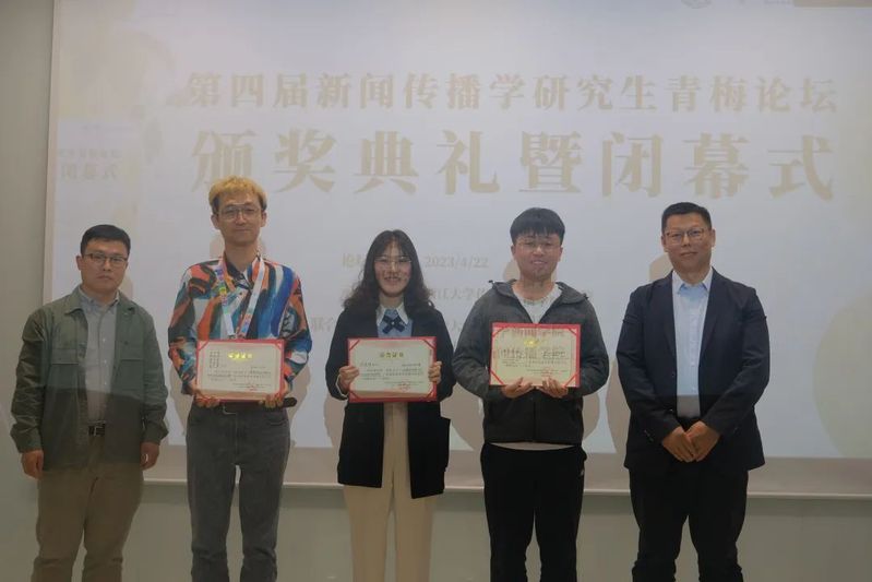 闭幕式上,韦路首先宣读了本届“青梅论坛”的获奖论文名单。第四届“青梅论坛”共产生6篇优秀论文,其中,一等奖论文由中国人民大学新闻学院硕士研究生张宇、陈科宇和余婉遥撰写的《情绪偏移:生育报道的情绪不一致性启动路径研究》获得;二等奖论文共两篇,包括中央民族大学新闻与传播学院本科生陈俊睿、母嘉怡、中央民族大学经济学院本科生董雯青、中央民族大学民族学与社会学学院本科生颜虹茹合作的《国家、资本与身体:生活方式新闻视角下健身报道的话语批判》和福建师范大学传播学院硕士研究生刘辉撰写的《平台社会的网络化地理景观——作为基础设施的数据中心网络研究》;上海交通大学媒体与传播学院博士研究生谢泽杭的《Does gossip affect people's healthy behavior:A moderated mediation model with evidence from Chinese villages》,浙江大学传媒与国际文化学院本科生叶子、张雨薇、董婉婷、盛艺蓝、陆晶晶、王梓璇、谭玉清的《“奇观化”祝福:赛博种族主义视角下的非洲人祝福视频及其消费》和扬州大学新闻与传播学院硕士研究生张媛媛的《网民如何以言行事?公共事件中标签话语行动形成机理的探究》三篇论文获得三等奖。安徽大学新闻传播学院葛明驷副院长、南京大学新闻传播学院朱江丽副院长、中国人民大学新闻学院韩晓宁副院长、中山大学新闻传播学院钟智锦院长分别为获奖同学颁奖。