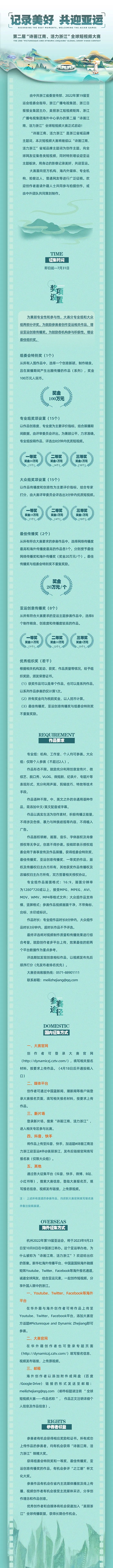 今年是全面贯彻落实党的二十大精神的开局之年,是“八八战略”实施20周年,也是杭州亚运会举办之年。本次短视频大赛继续以“诗画江南、活力浙江”省域品牌主题词为创作主题,向全球网友征集各类短视频,同时特别增设迎亚运主题板块,用身边的影像记录美好,共迎亚运。