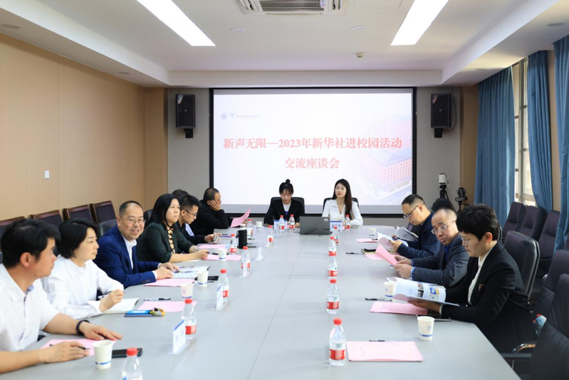 2023年5月13日上午,新华社参考消息报社、新华社新闻信息中心浙江中心一行在我院党委书记王庆文、副院长赵瑜、洪宇的陪同下莅临传媒与国际文化学院指导,进入传媒实验教学中心参观,召开“新声无限——2023年新华社进校园活动”座谈会交流。