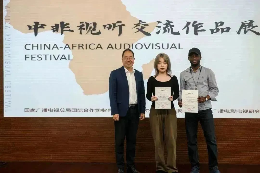 在组委会宣读完入选“中非视听交流作品库”的作品名单后,王庆文书记为导演代表弗洛吉、黄郁苒颁发展映证书。