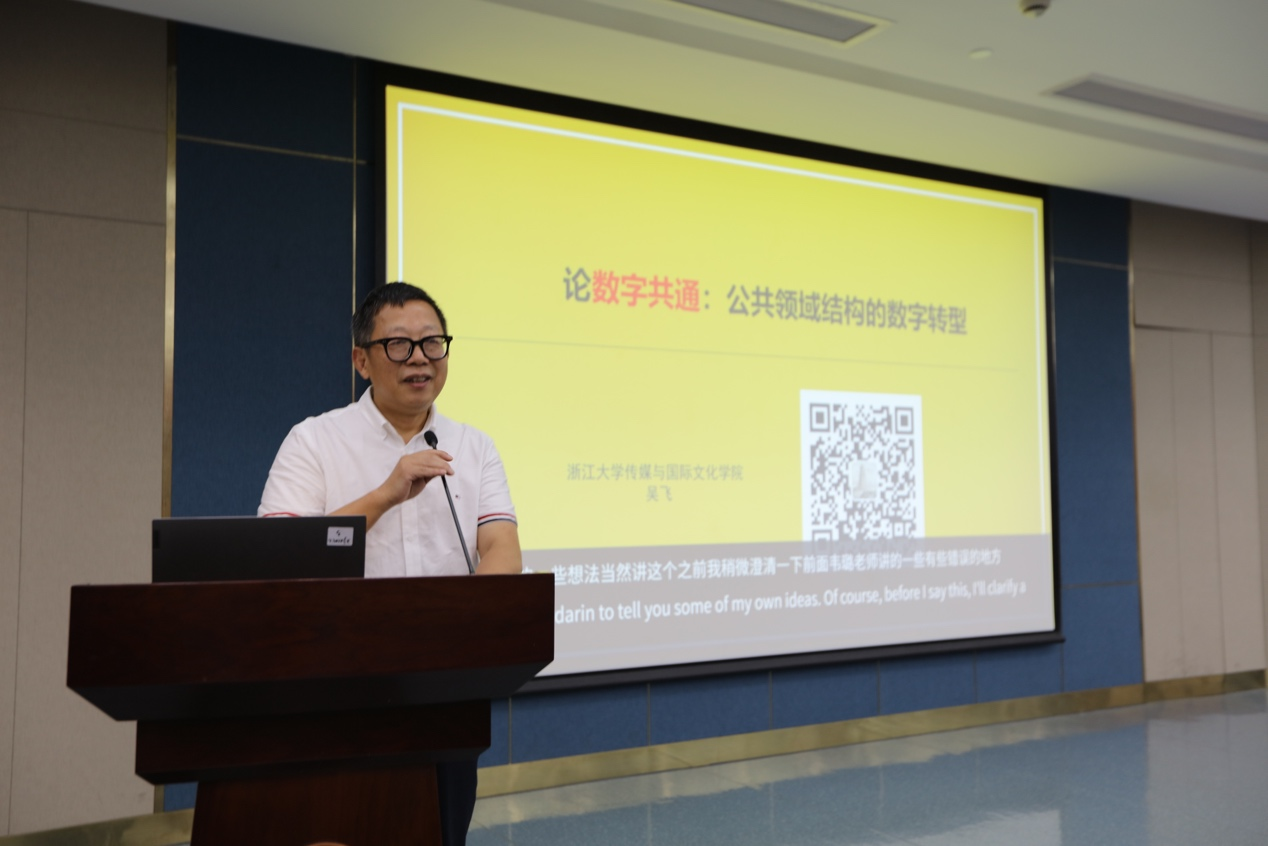 随后,浙江大学传媒与国际文化学院吴飞教授带来了“数字共通:理解数字时代社会交往的新假设”的主题讲座,讲座由浙江大学百人计划研究员黄广生主持。吴飞教授从数字化生存的背景展开,认为数字化、网络化、信息化使人的生存方式发生了巨大变化,并由此带来一种全新的生存方式。接着吴飞教授回顾了公共领域理论的渊源与发展,并针对先前理论的不足提出“数字共通“的理论假设。吴飞教授提出,数字共通强调的是人类命运共同体的共感而生,要有“类”的思维与实践。