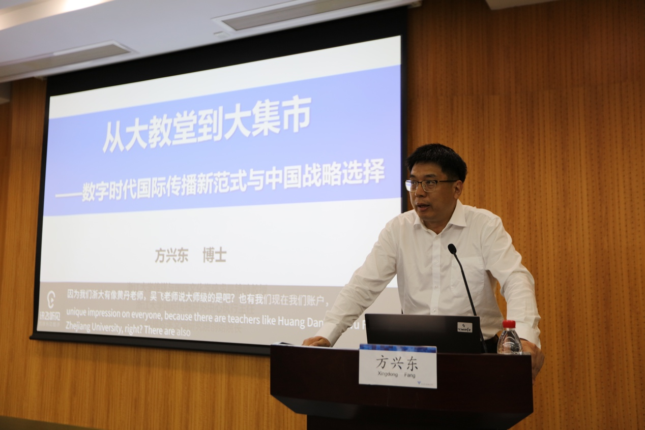 7月4日上午,浙江大学传媒与国际文化学院方兴东教授带来了“从大教堂到大集市——数字时代轨迹传播新范式与中国战略选择”主题讲座,讲座由章宏副教授主持。方兴东教授从他近期的欧洲之行的经历展开演讲,他提出为什么欧美没有国际传播?在网络时代,所有国内传播都是国际传播,所有的国家传播也是国内传播。因此,需要重估国际传播,这是中国新闻传播学科的“胜负手”。国际传播具有中国使命与意义,人类新的信息传播格局已经全面形成,传播正在重塑社会秩序和国际秩序。作为应用学科,新闻传播学的合法性可能通过国际传播得以重塑。