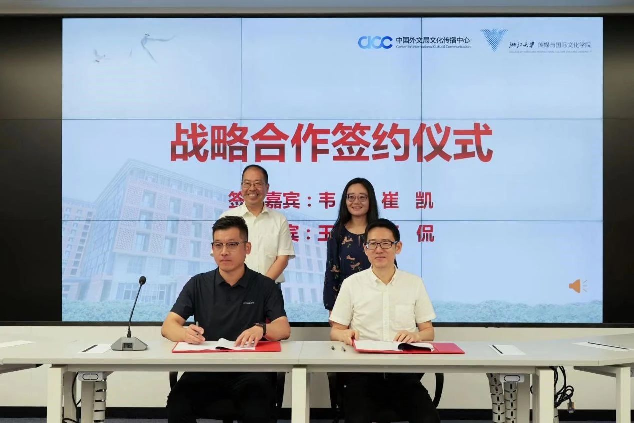 接下来,浙江大学传媒与国际文化学院院长韦路与中国外文局文化传播中心数字文化推广部主任崔凯签署“中国外文局文化传播中心——浙江大学传媒与国际文化学院战略合作框架协议书”,见证双方在基地建设、交流平台搭建、学术研究、媒体资源整合、人才培养等方面达成合作。