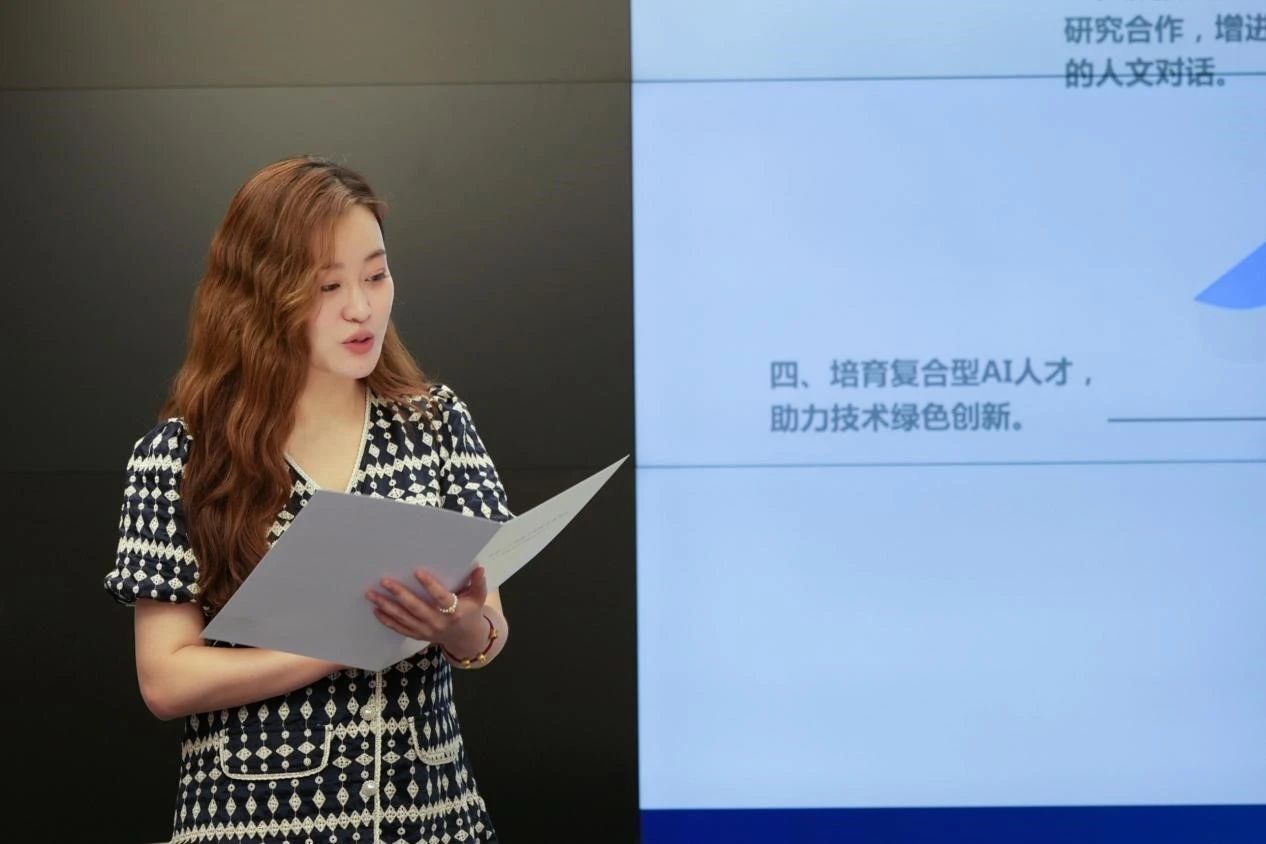 在《全球人工智能可持续发展倡议》(以下简称《倡议》)发布环节,浙江大学传媒与国际文化学院百人计划研究员、浙江大学国际传播研究中心副主任赵瑜佩宣读倡议内容。《倡议》围绕“人工智能可持续传播”这一议题,以“人工智能绿色传播与素养提升”为核心要义,以“推动AI各界合作和共识建立”为宗旨,提出:要求业界提升算法及数据库的透明性和可解读性;推进产、学、研、用深度交流与融合;并以上述建设成果为依托,探究绿色传播的可行路径、全球公民素养提升的教育路径、人工智能发展的创新路径,助力全球数字善治。