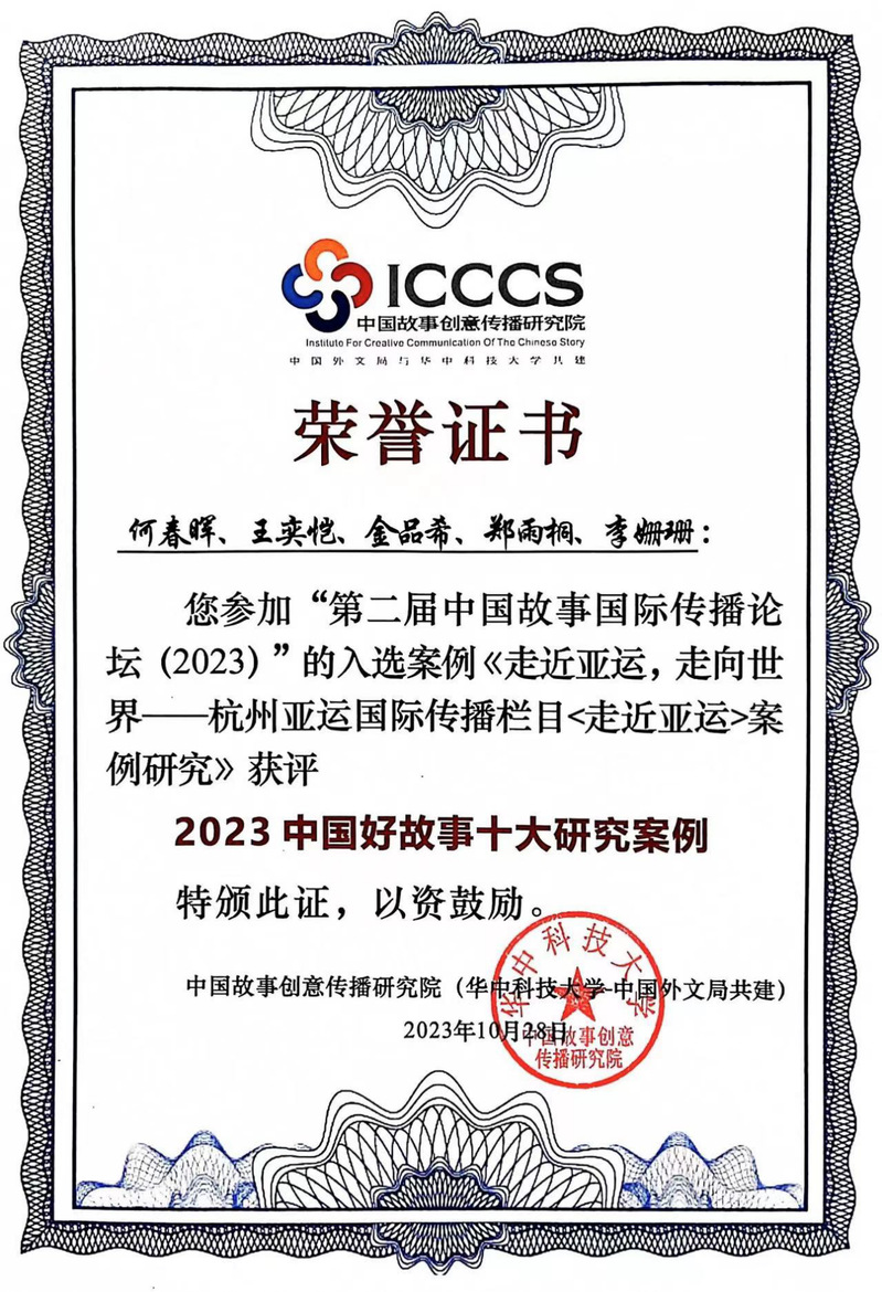 10月27日至28日, 第二届中国故事国际传播论坛(2023)在武汉华中科技大学顺利举行。本届论坛立足于党的二十大精神,以“十年回眸:讲好中国故事,提升国际传播能力”为主题,致力于发现一批中国故事国际传播高质量研究成果,挖掘一批中国故事国际传播的典型案例,探讨中国话语和中国叙事体系的构建之路。来自国内外各大高校、科研院所的专家、学者和学生共同参与了本次论坛,共同探讨中国故事及其背后的思想力量与精神力量。我院提交的《走近亚运,走向世界——杭州亚运国际传播栏目<走近亚运>案例研究》获评本届“2023中国好故事十大研究案例”。