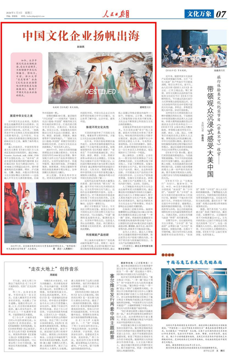 2024年1月3日,《人民日报·海外版》《CGTN》刊发了我院赵瑜佩老师题为《中国文化企业扬帆出海》的文章。