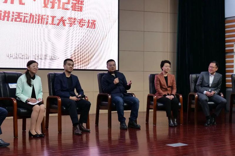 接下来,浙江大学传媒与国际文化学院传播学本科生蒋昕茹同学主持提问互动环节,各位“新时代·好记者”巡讲团的记者们和在场的传媒先锋培训班的学子们进行了深入的交流,巡讲团成员们为同学们分享了许多关于如何成为一名好记者的亲身体会与切实建议。