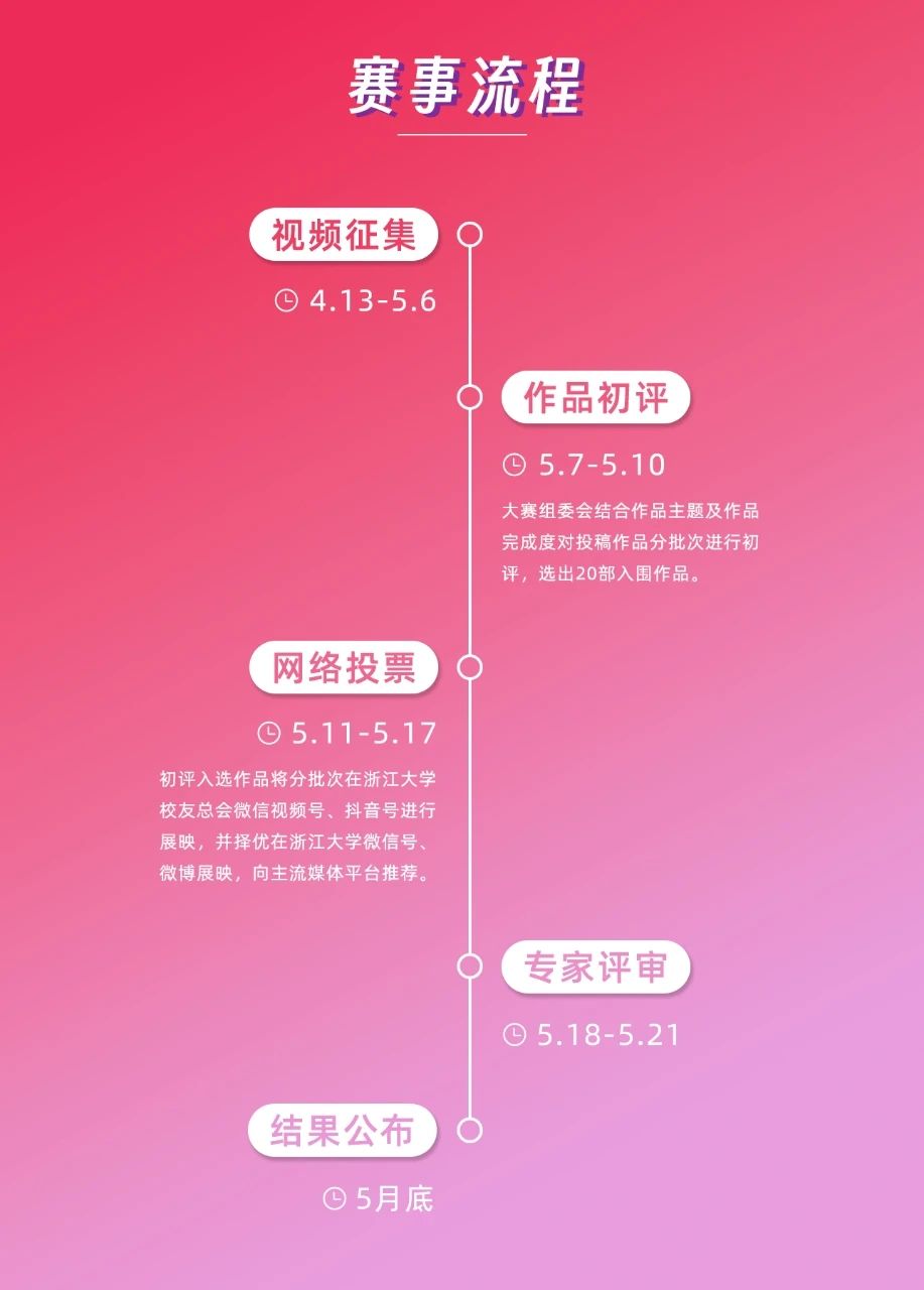 互动方式:参赛者可在微信视频号发布原创作品@浙江大学校友总会微信视频号,并添加话题 #好看浙大