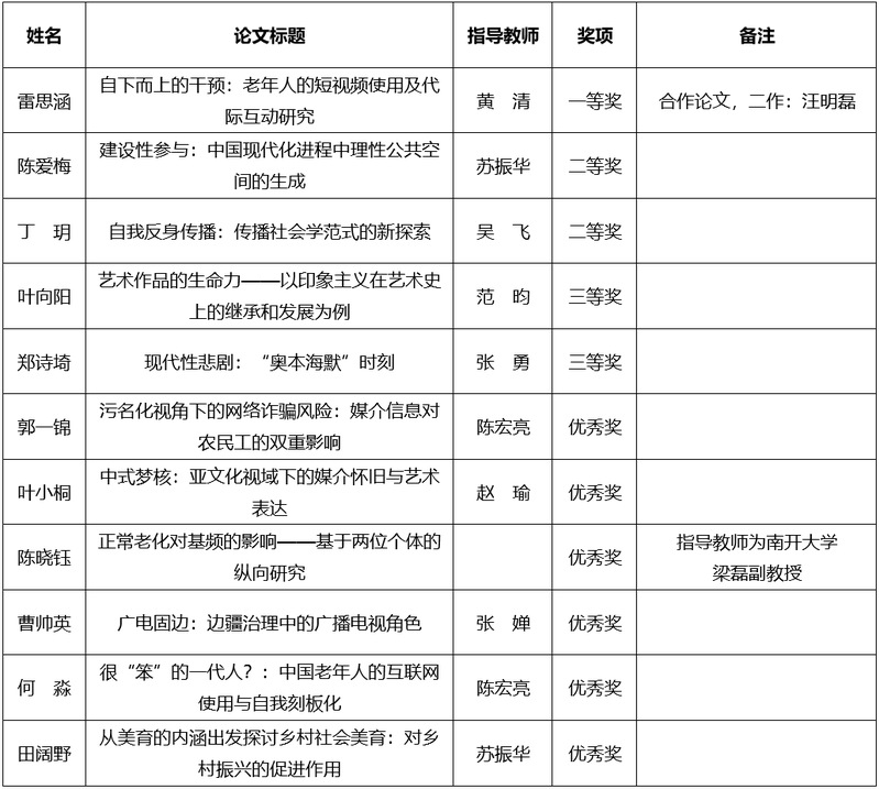经学生自主投稿、评委评审,传媒与国际文化学院首届“望道”学生学术论文报告会共评选出获奖论文22篇,其中一、二、三等奖10篇,优秀奖12篇。获奖名单如下: