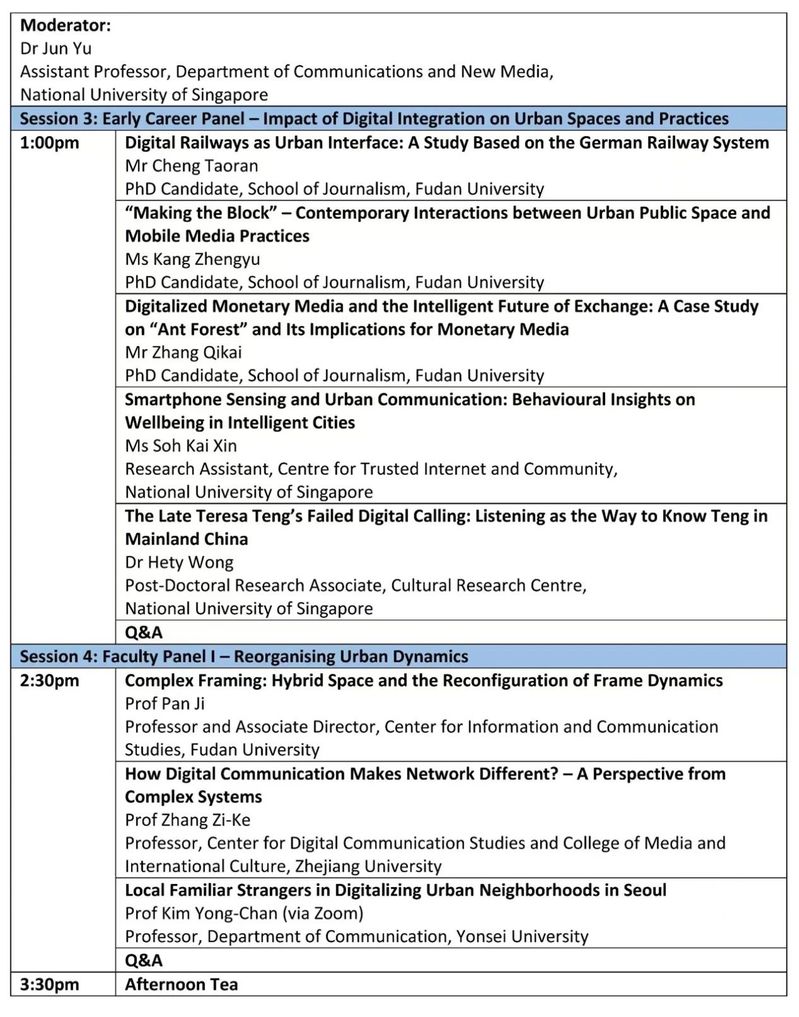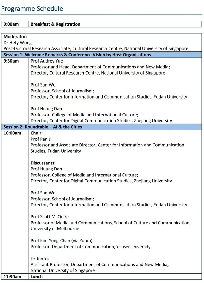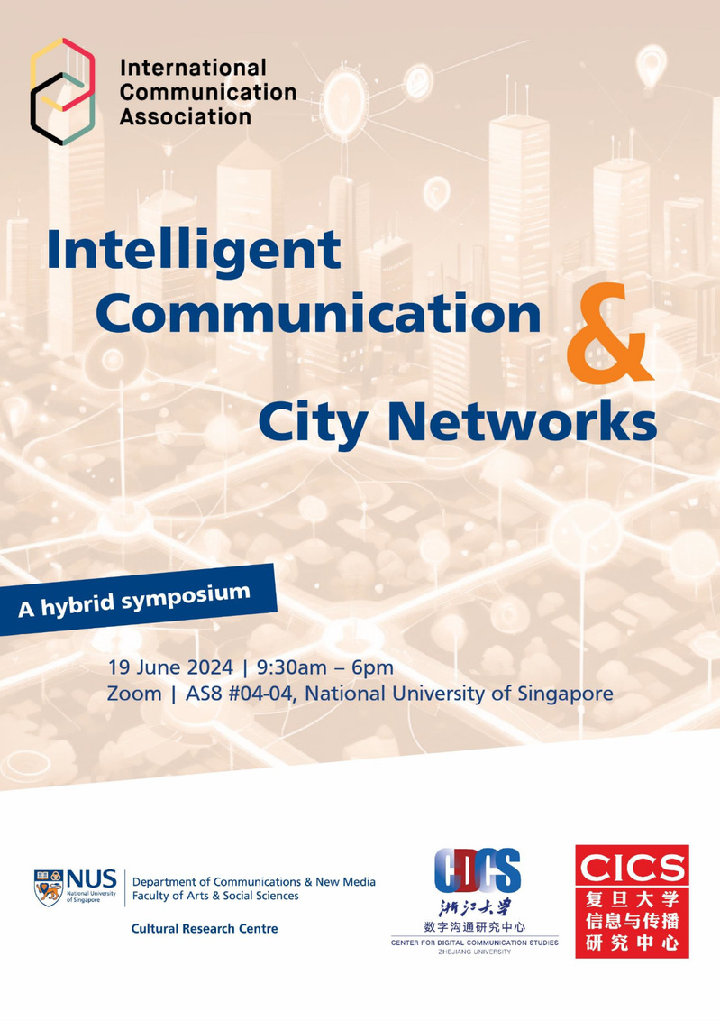 由复旦大学信息与传播研究中心、浙江大学数字沟通研究中心、新加坡国立大学文化研究中心联合主办的ICA(国际传播学会)会前会——“Intelligent Communication & City Networks(智能传播与城市网络)”将于2024年6月19日于新加坡国立大学举行。来自复旦大学、浙江大学、墨尔本大学、新加坡国立大学、伦敦政治经济学院等世界知名高校的研究者与青年学者,将围绕人工智能与城市、都市空间与数字媒介实践、数字叙事与城市文化、技术创新与都市生活等话题,展开讨论。