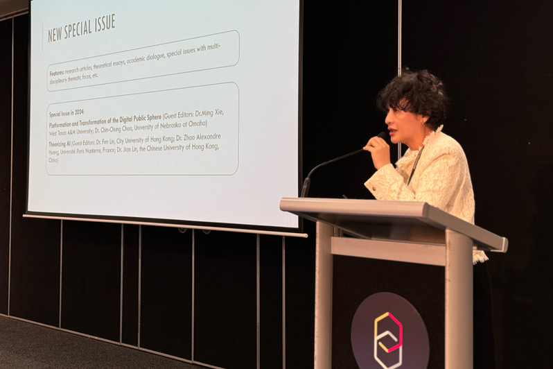 随后,香港城市大学黄懿慧教授介绍了英文期刊《传播与公共》(Communication and the Public)的近期发展情况。她指出,期刊近年来发展势头强劲,投稿数量和质量稳步提升,国际影响力不断提高。她向参会者介绍了近期将推出的《人工智能理论化》(Theorizing AI)等特刊,并诚挚邀请全球学者积极投稿。