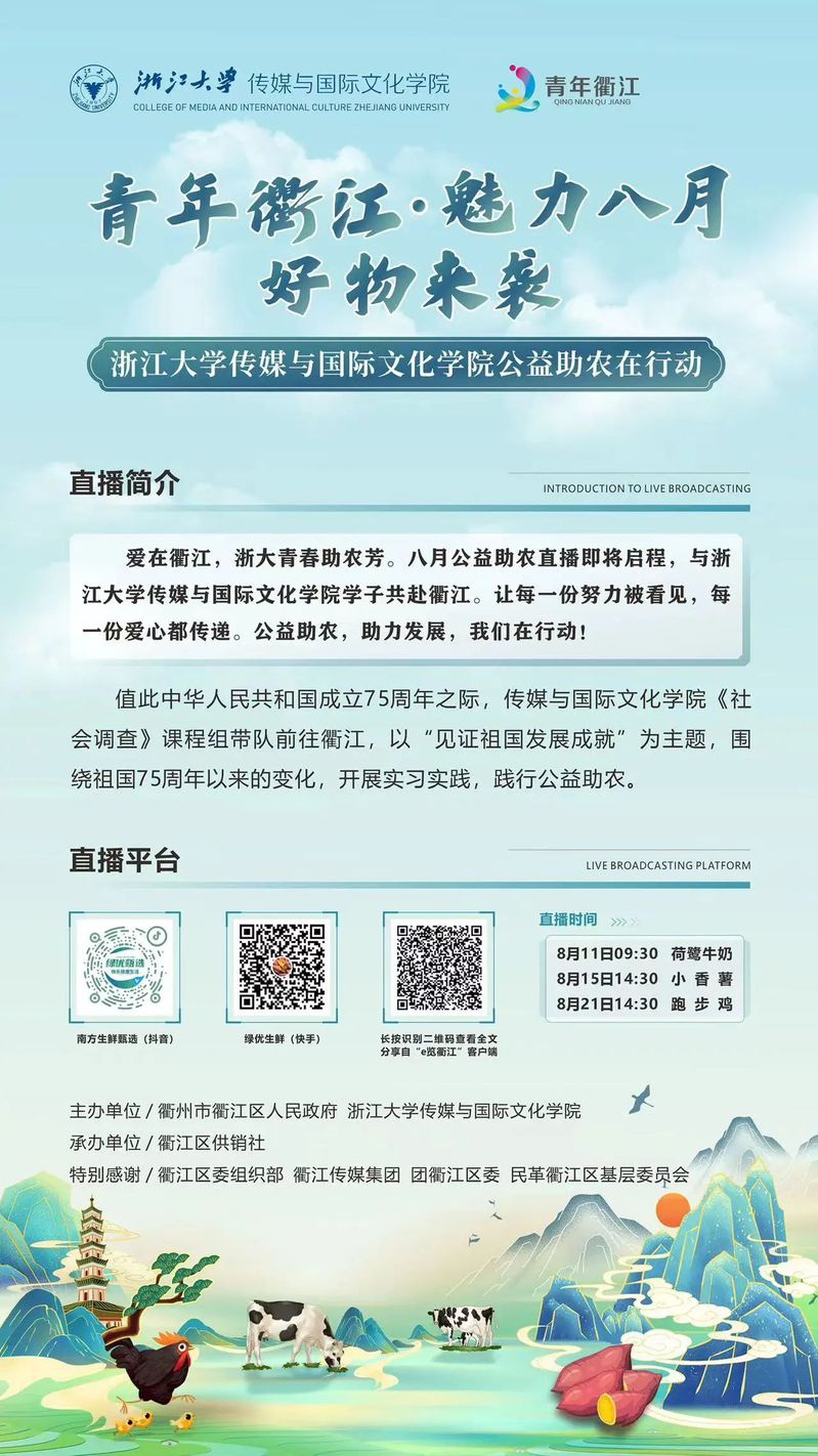 爱在衢江,浙大青春助农芳!八月公益助农直播即将启程,与浙江大学传媒与国际文化学院学子共赴衢江。让每一份努力被看见,每一份爱心都传递。公益助农,助力发展,我们在行动!