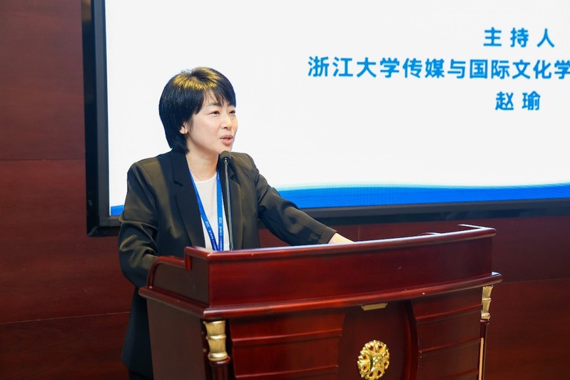 (图为浙江大学传媒与国际文化学院副院长、教授赵瑜主持开幕式)