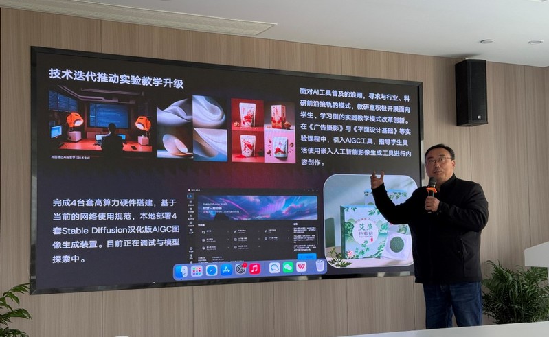 在上午的教学经验分享环节,教研室负责人卢小雁首先作《Al及相关数字技术在高校传媒实验及实践教学领域的应用》主题报告,向与会嘉宾介绍了浙江大学传媒实验教学中心目前对于AI技术及相关数字技术的引入与未来规划。
