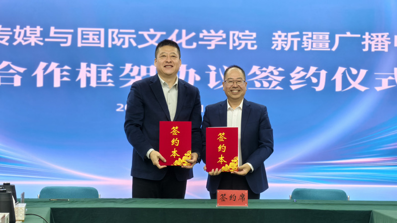 新疆广播电视台以其独特的地理区位优势和丰富的民族文化资源,为合作提供了广阔的空间。随后的座谈会上,双方就未来合作内容和途径展开深入交流,并签署了战略合作框架协议。未来,双方将在党建共创、学科发展、人才培养、产学研共研共创、国际化项目合作等方面,以“文化+科技”融合发展为核心,因地制宜发展新质生产力,研究布局新业态、新体验、新模式,深入推进合作。