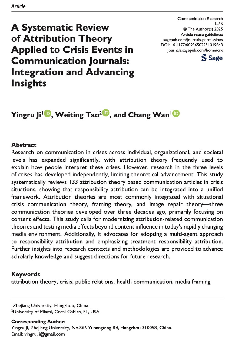 近日,我院“百人计划”研究员纪盈如联合迈阿密大学陶炜婷副教授及本院博士生万畅共同完成的论文《归因理论在危机事件中的解释力:系统性综述、理论融合与前沿洞见》(A Systematic Review of Attribution Theory Applied to Crisis Events in Communication Journals: Integration and Advancing Insights)在 SSCI 传播学顶刊《传播学研究》(Communication Research)正式刊发。该论文是纪盈如即将出版的专著《归因偏见:社交媒体时代的舆论心理学》中的一项相关实证研究。