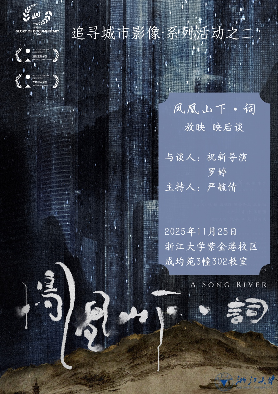 《凤凰山下·词》记录了导演祝新通过宋词这一媒介,回望杭州城市变迁,并展开一场跨越时空的追寻,探索历史与当下、与个人记忆关联的过程。该片于2024年在平遥国际电影展首映,并获得了青年评审荣誉影片。祝新导演将亲临现场,与浙大师生进行映后交流。