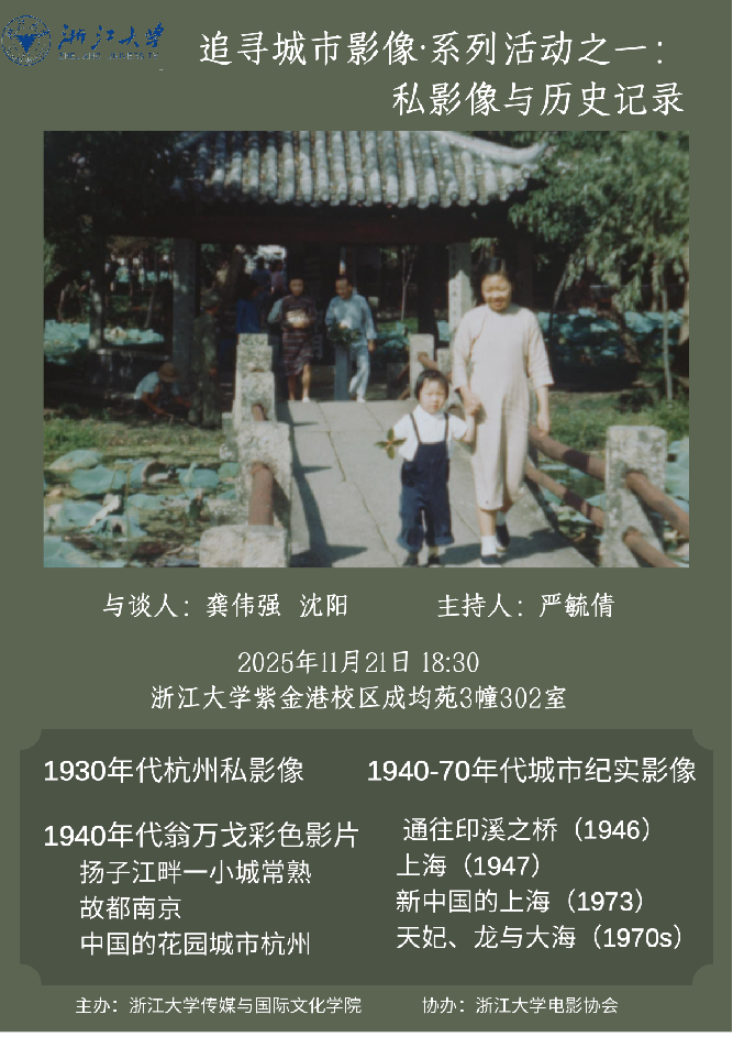 11月21日与11月25日,我们将在浙江大学传媒与国际文化学院举行两场关于城市影像的放映与交流。从1930年代到1970年代的历史纪实影片,到当代青年导演镜头下对杭州城市历史的诗意追寻,我们将通过影像,与大家一起探讨城市空间、栖居者与记录者关系。