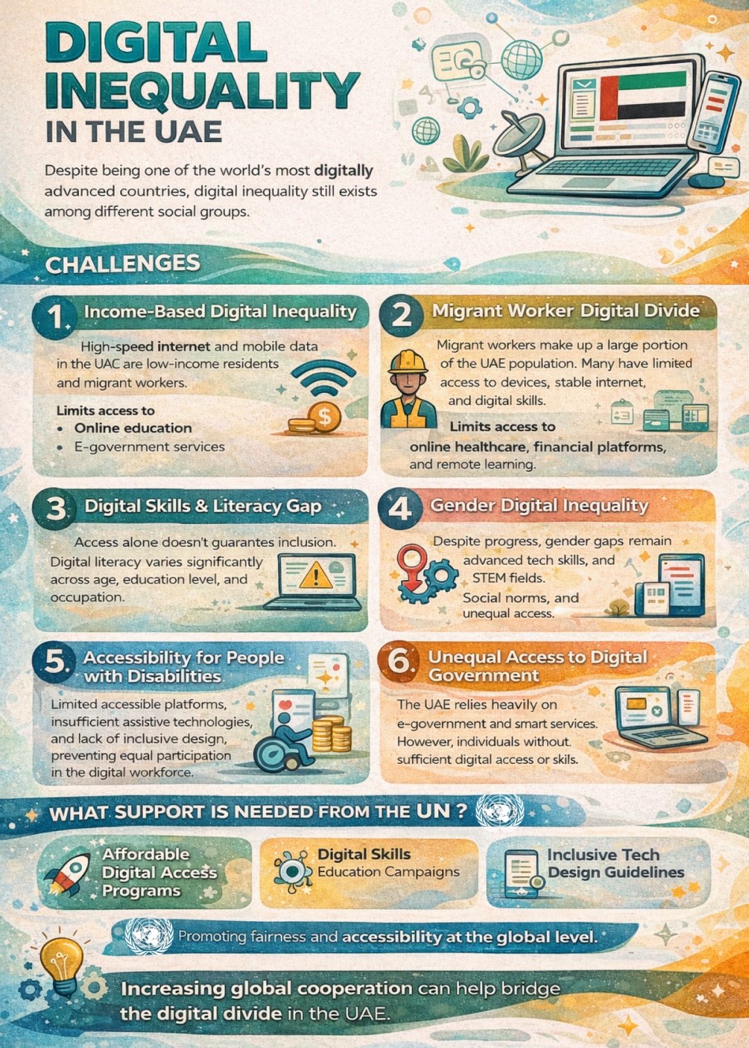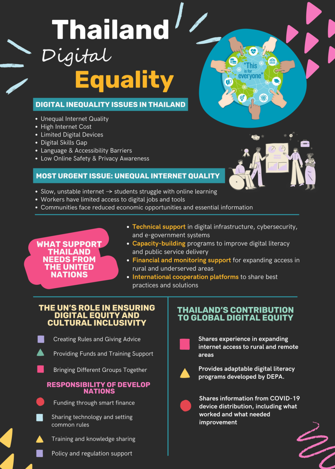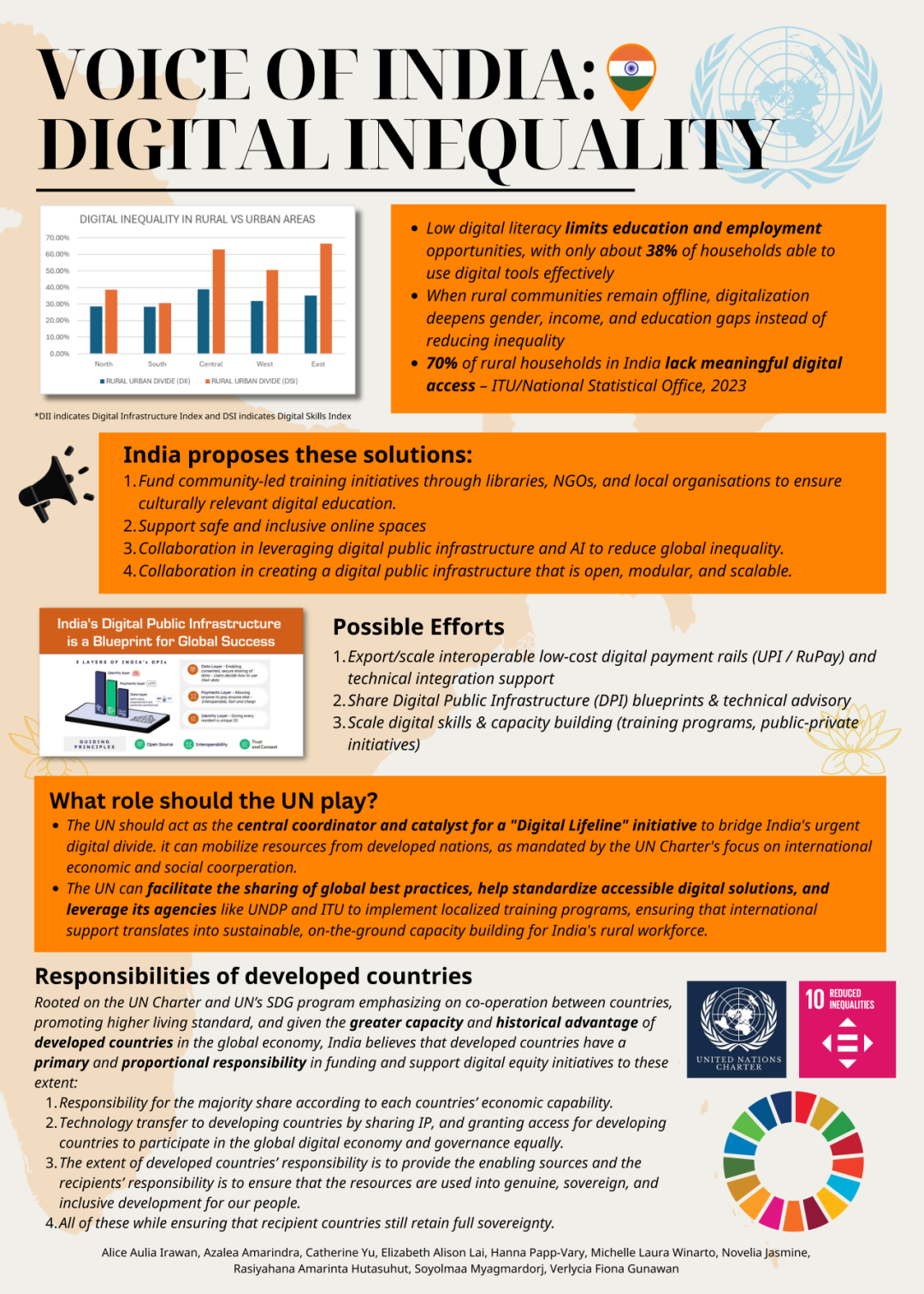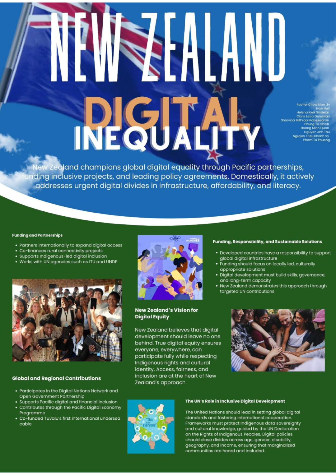 针对数字基础设施建设议题,泰国与印度尼西亚代表聚焦于群岛地理环境带来的特殊困难,将“网络质量不均且不稳定”列为最紧迫的挑战;孟加拉国代表则指出国内存在数字政策执行薄弱、农村基建投入不足等问题,亟需在扩大农村宽带覆盖、资助数字扫盲计划、推广可负担的智能设备与低成本数据服务等方面获得支持;针对家庭、学校与原住民数字接入议题,印度代表以数据指出农村地区超过半数的家庭缺乏有效数字接入,倡导通过社区主导的培训与国际合作弥补鸿沟;新西兰代表则强调应在数字进程中融入本土文化保护与原住民权利保障;针对发达国家的数字素养鸿沟议题,美国代表指出数字鸿沟已从“接入问题”转向“技能问题”,美国国内有一定劳动力缺乏基础数字能力;法国代表指出法国国内城乡与区域间的数字素养存在巨大断层,近半数小型企业因资源有限难以实现数字化转型;克罗地亚代表强调城乡宽带覆盖与数字技能的双重差距;阿联酋代表则反思即便在数字化领先国家,收入、移民身份、性别与残障等因素仍可能导致数字排斥。