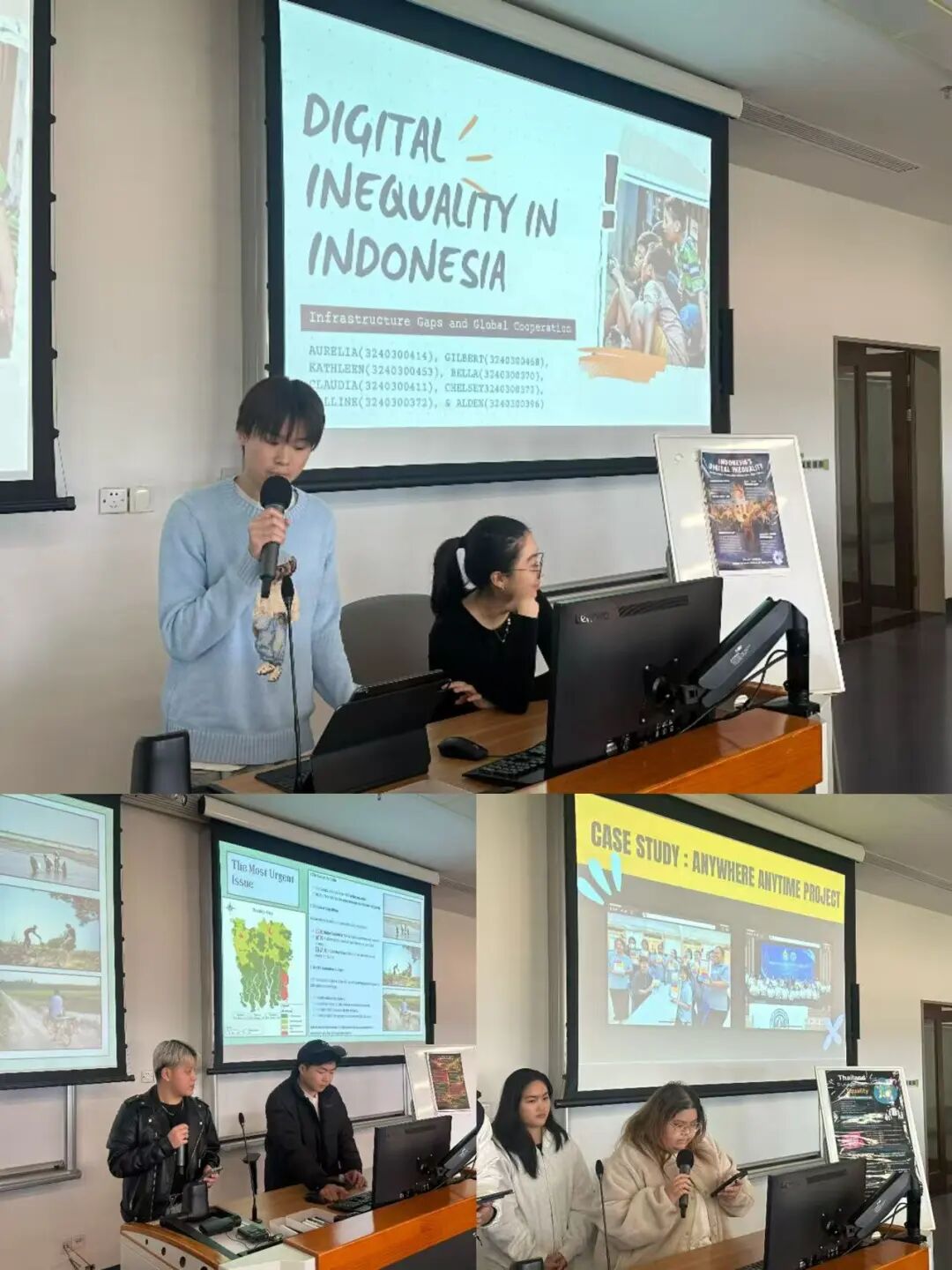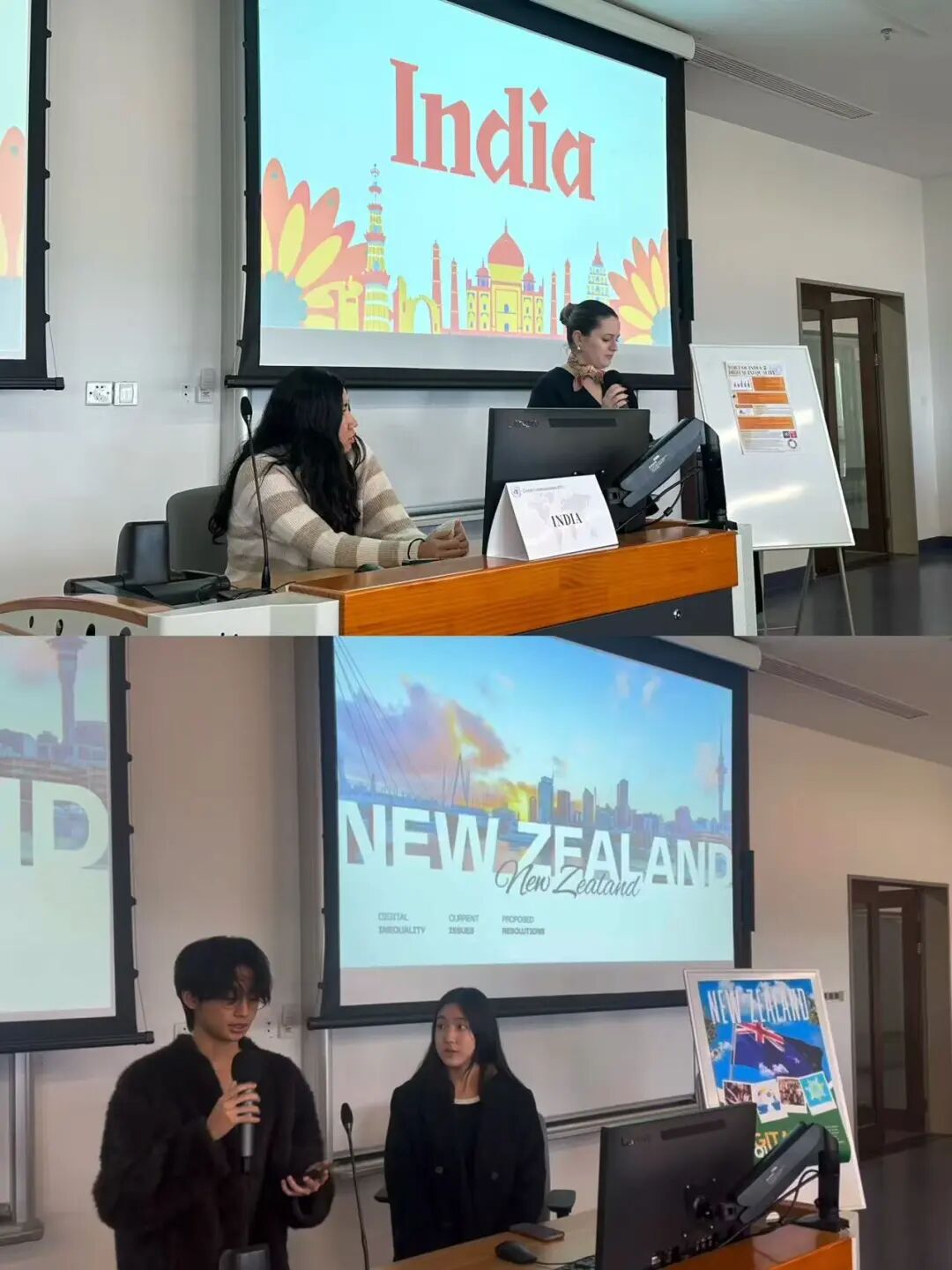 近日,学院和国际联合商学院(ZIBS)、浙江大学国际传播研究中心 共同开设的课程《全球传播》结课。该课程为省级一流本科国际化课程,课程教师赵瑜佩曾以此课程获评浙江省高校教师教学创新大赛特等奖、浙江大学高校创新大赛特等奖。本学期课程以一场聚焦“数字平等”的模拟联合国活动收尾,来自印度尼西亚、泰国、墨西哥、新加坡、越南、克罗地亚、俄罗斯、英国等国的学生组队,深入探讨各国在数字包容、基础设施、技能赋能与治理合作等方面面临的挑战与可行路径。