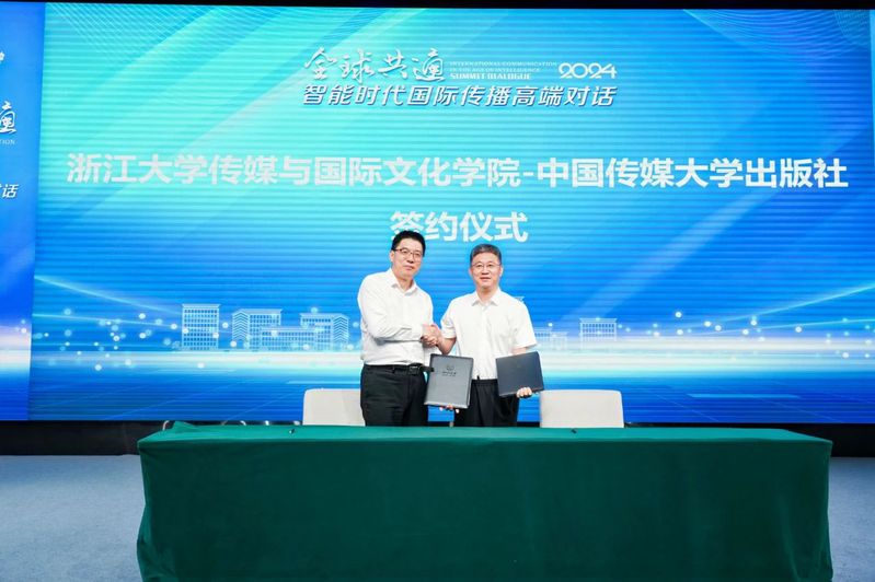 The signing ceremony between School of Media and International Culture of Zhejiang University and Communication University of China Press was also held at the meeting. Zhang Yuqiang, President of Communication University of China Press, and Fang Xingdong, Executive Vice Dean of School of Media and International Culture, Zhejiang University signed the agreement. In the next step, the two sides will jointly promote the production, publication and promotion of the international spread series of financial media products, and further strengthen cooperation in the design of course materials, various professional workshops and seminars.
