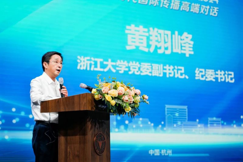 浙江大学党委副书记、纪委书记黄翔峰致辞。他首先代表学校对参与本次高端对话的国际传播相关领域的专家学者表示欢迎。他表示,2021年5月31日,习近平总书记在中共中央政治局第三十次集体学习时强调,讲好中国故事,传播好中国声音,展示真实、立体、全面的中国,是加强我国国际传播能力建设的重要任务。近年来,浙江大学在打造具有国际影响力的国内一流国际传播研究高地的过程中取得了重要成果。当前和今后一个时期,学校要进一步努力加强国际传播能力建设和人才培养,为推动构建人类命运共同体做出积极贡献。
